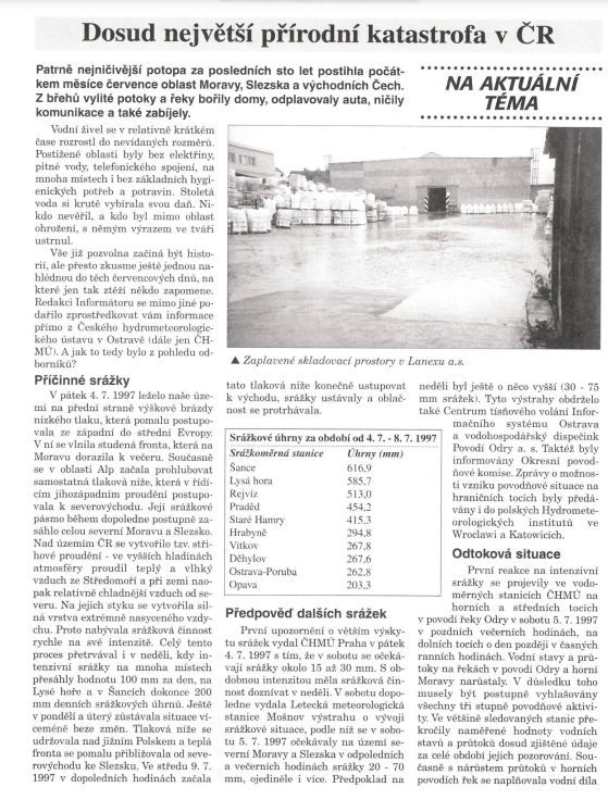 Pavel Schiesser, technický ředitel Lanexu: „V pondělí po poledni již začala odvodňovacím příkopem za Lanexem téct voda, která stoupala tak rychle, že ve 13.30 hod. bylo nezbytně nutné přistoupit k okamžitému vystěhování skladů… V době nejvyššího stavu hladiny scházelo 5 cm k tomu, aby se voda dostala i do nového regálového skladu. Díky obětavosti samotných zaměstnanců se však podařilo škody na majetku takřka minimalizovat...“